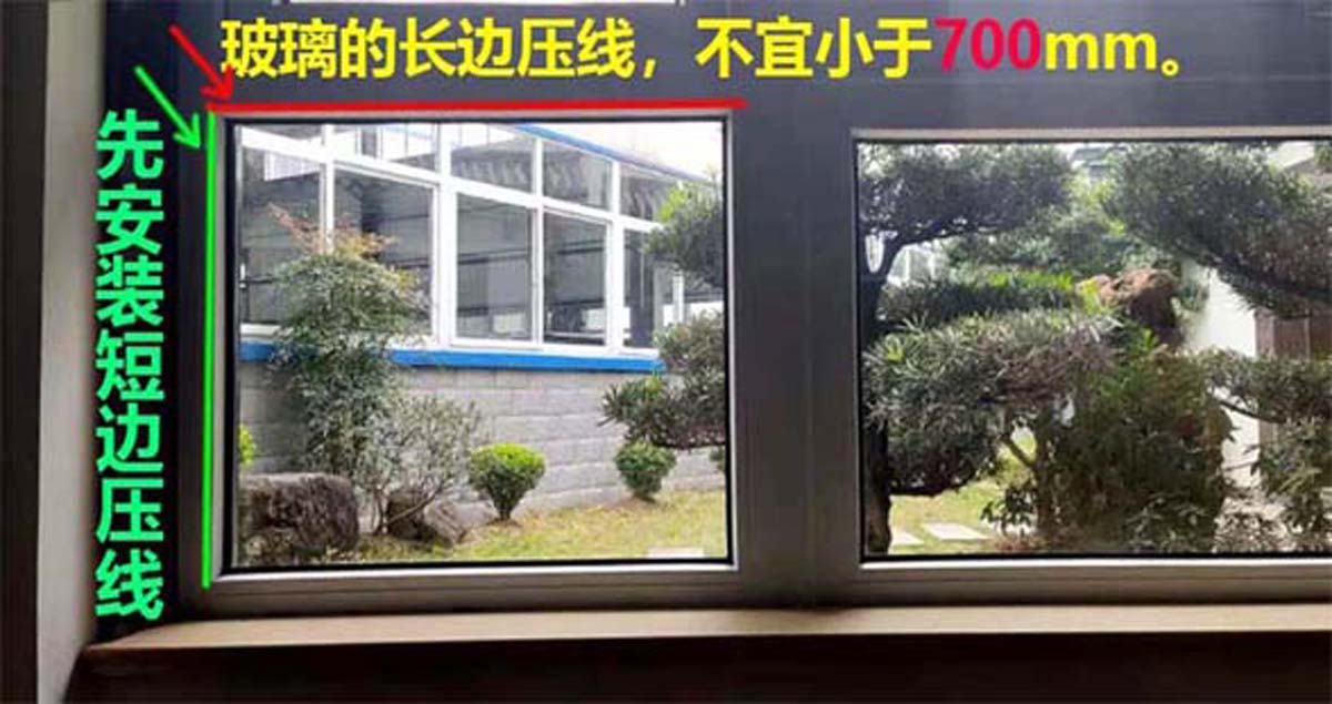 塑鋼門窗玻璃壓線,先安裝短壓線,再安裝長(zhǎng)壓線,長(zhǎng)壓線安裝時(shí),先將壓線彎曲,將壓線的兩頭扣進(jìn)壓線槽,再用塑膠錘沿壓線兩端往中間敲擊,使壓線完全扣進(jìn)槽內(nèi)。玻璃壓線最少有一邊長(zhǎng)度不小于700mm,否則會(huì)影響壓線安...